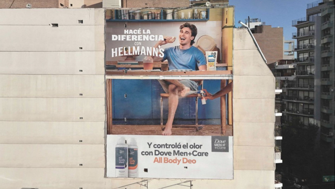 Entre los billboards intervenidos aparecieron creatividades de Hellmann’s, Skip y el marketplace On City, marcas que conviven dentro del portafolio de Unilever.