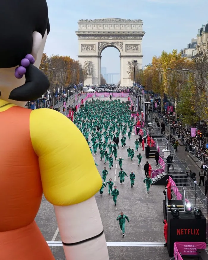 La atmósfera en los Campos Elíseos fue electrizante, con fanáticos vistiendo uniformes icónicos de la serie y una réplica de la siniestra muñeca que domina el juego de luz roja – luz verde. Este icónico elemento sirvió como el centro de atención, llevando a los participantes a revivir la adrenalina y el suspenso que caracteriza al programa.