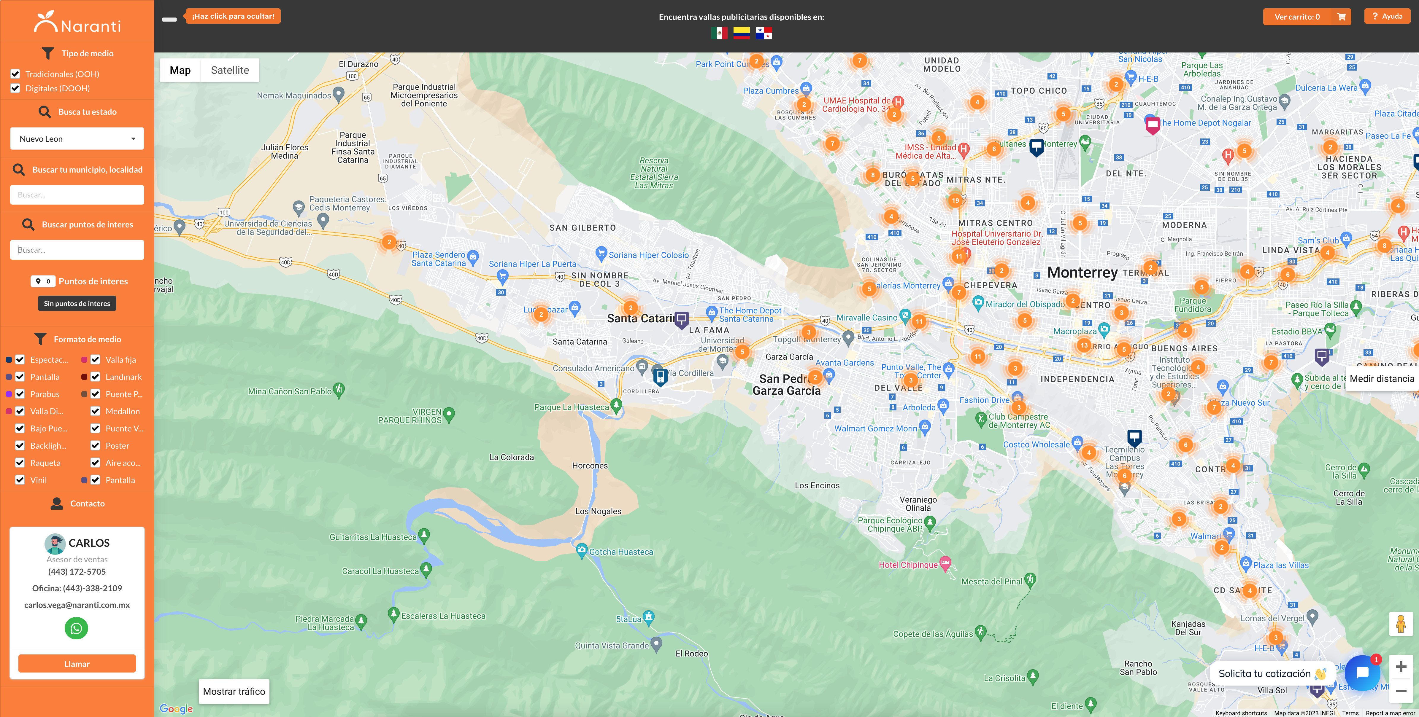 La competitividad en el mercado publicitario es feroz, pero Naranti sobresale gracias a su avanzado sistema de mapeo. Este sistema, actualizado diariamente por nuestro equipo, no solo te permite localizar vallas publicitarias por estado o ciudad, sino que también destaca el número de medios publicitarios disponibles, como pantallas, puentes, espectaculares, mupis y puentes peatonales.