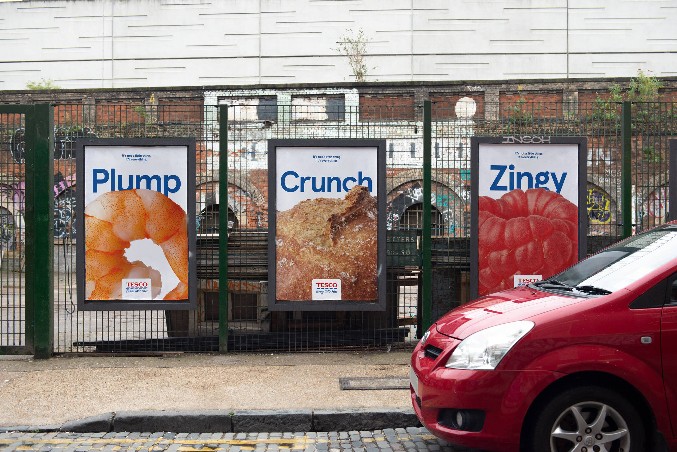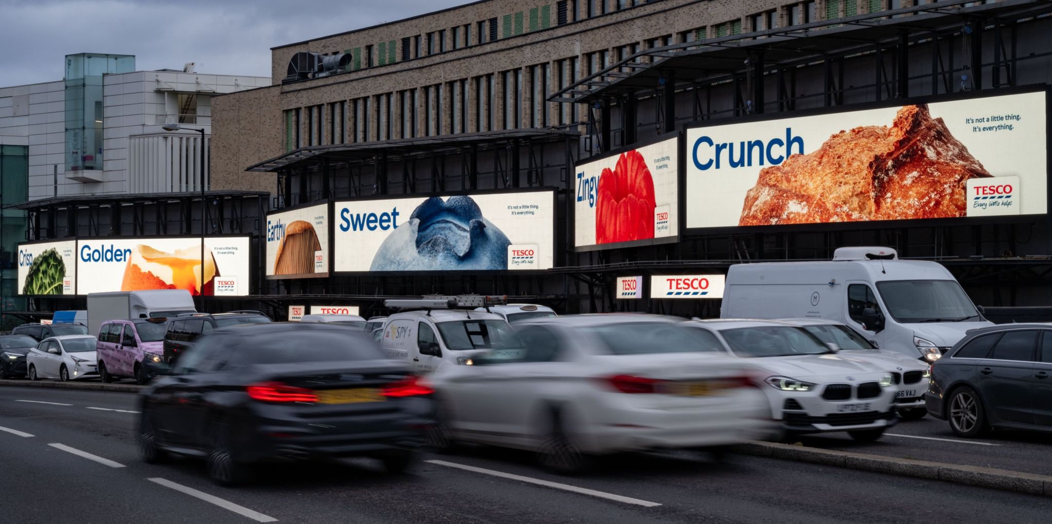 Uno de los puntos más destacados de esta campaña es su diseño visual. Tesco utilizó grandes formatos OOH para mostrar primeros planos de alimentos frescos, acompañados de palabras clave como “Crujiente” "Cremoso" "Jugoso". Estos anuncios no solo buscan captar la atención, sino también ofrecer una experiencia visual que resalta la calidad de los productos de Tesco, poniendo en evidencia lo que realmente importa a la hora de disfrutar una buena comida: los pequeños detalles. La fotografía resalta la textura, el color y la forma de los alimentos, creando una conexión inmediata con el espectador. Esta publicidad permite que el mensaje sea visible y memorable, además de ser fácilmente accesible para una audiencia diversa.