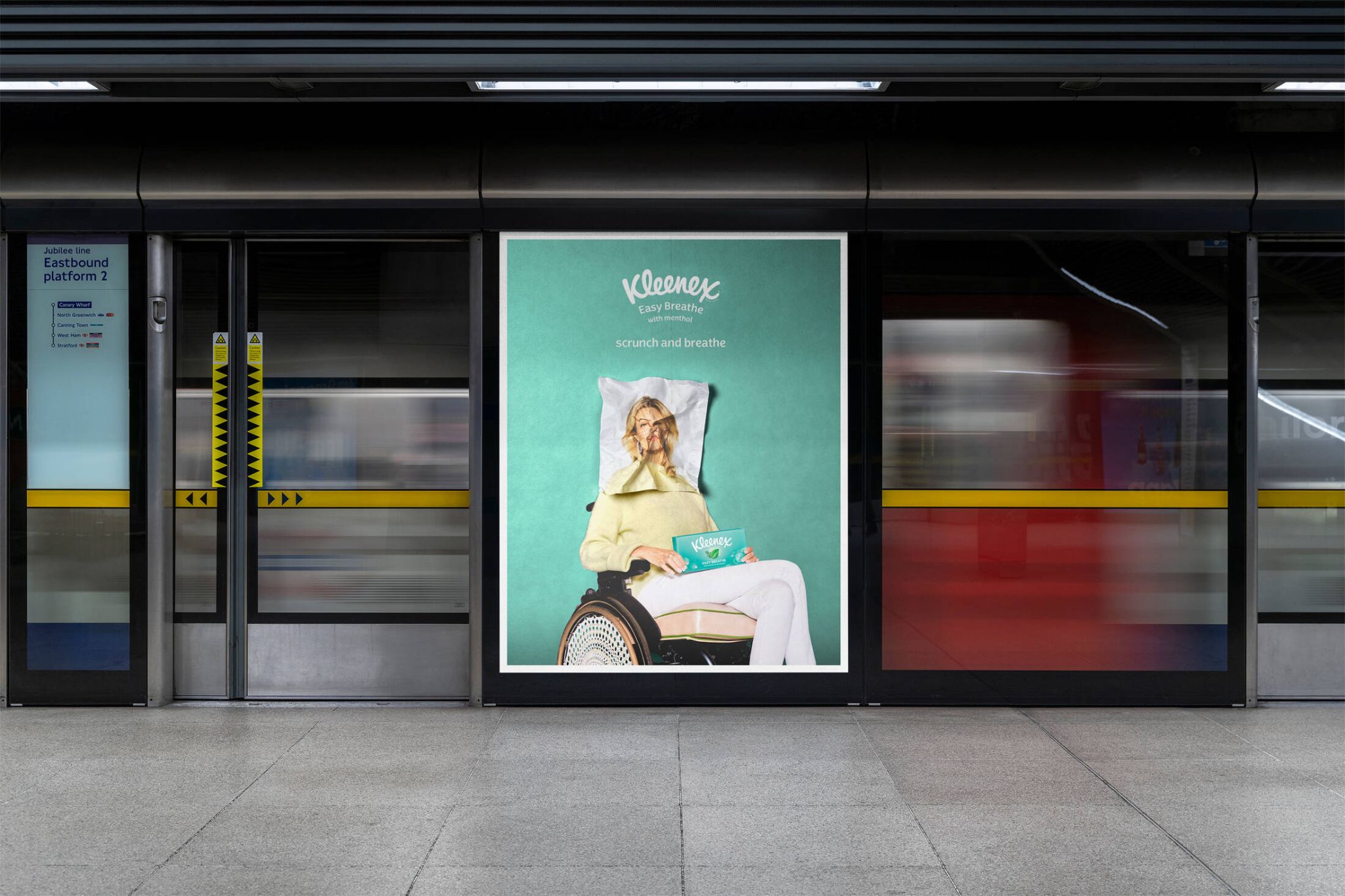 Para completar la experiencia de «Scrunch and Breathe», Kleenex organizó una activación en el centro comercial Westfield White City en Londres, donde los visitantes pueden vivir de primera mano los beneficios de los pañuelos Easy Breathe. Durante el evento, las personas pueden probar los pañuelos, experimentar la frescura del mentol y ver los “retratos congestionados” en persona. Es una forma perfecta de conectar con los consumidores y celebrar el aniversario 100 de la marca con un toque innovador.