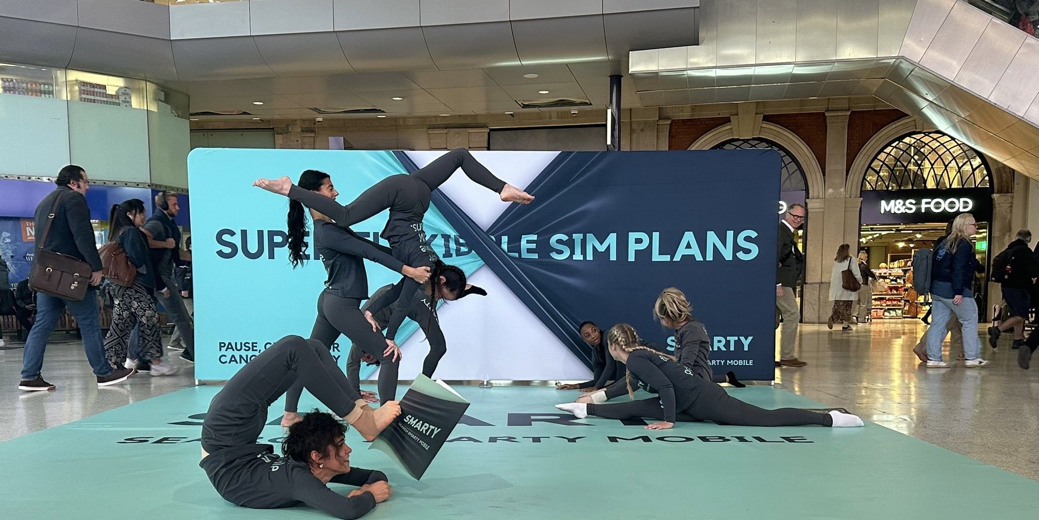 Por si fuera poco, la campaña se hizo presente en la estación de tren más concurrida de Londres: Waterloo. Aquí, gimnastas realizaron acrobacias mientras repartían ediciones especiales del Metro, el famoso periódico de la ciudad. La portada no fue cualquier cosa: SMARTY Mobile creó la primera portada pop-up del Reino Unido, dándole a los lectores una experiencia visual que no podían ignorar; logrando una experiencia completa que generó interacción inmediata con los usuarios. Los gimnastas, con su flexibilidad y agilidad, reflejaban perfectamente la esencia de la campaña.