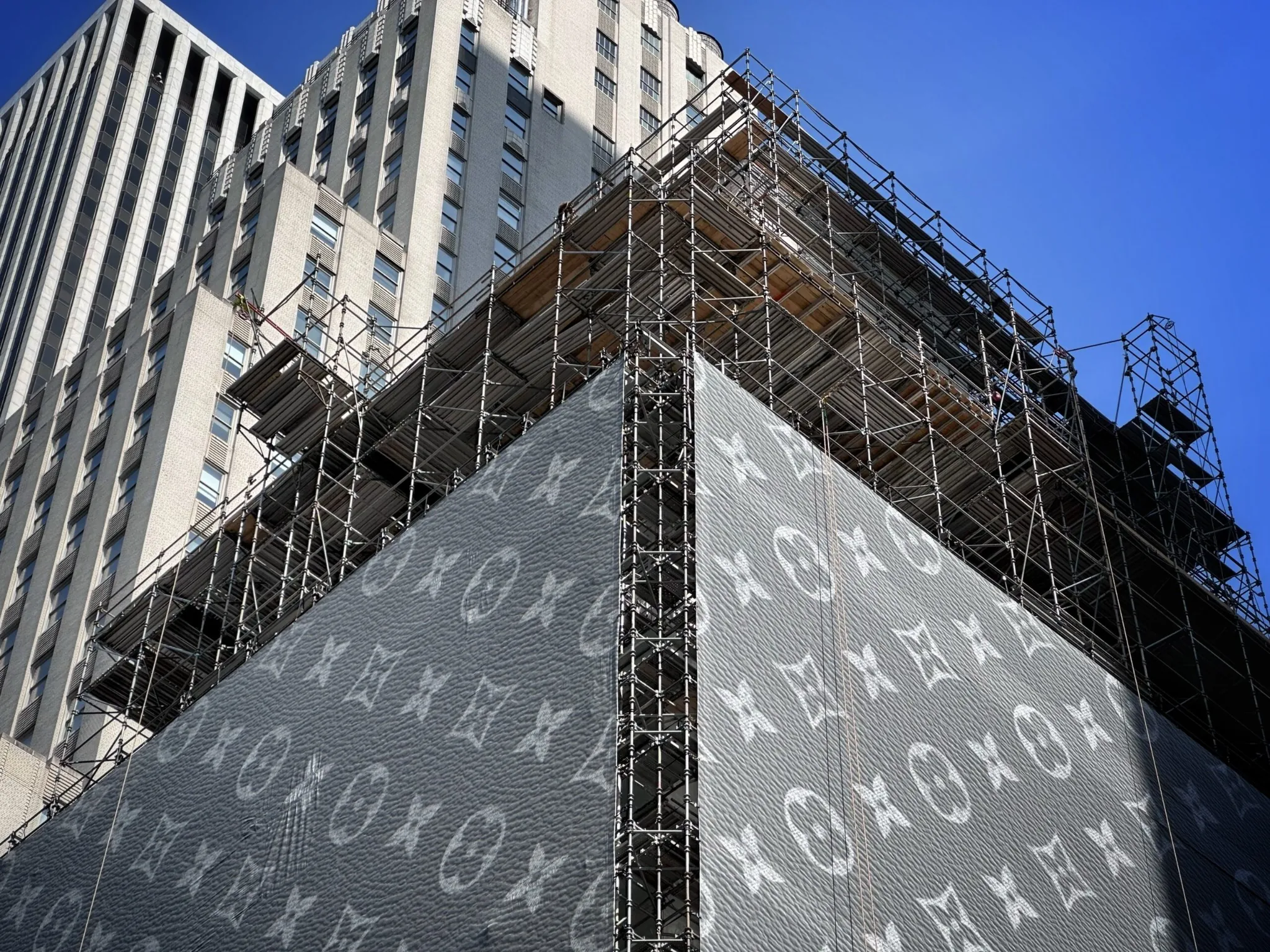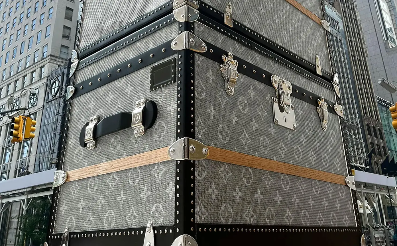 Louis Vuitton está renovando su flagship store en Nueva York y, en lugar de cubrir la obra con lonas comunes, decidió vestir toda la estructura de construcción con el diseño icónico de sus maletas.